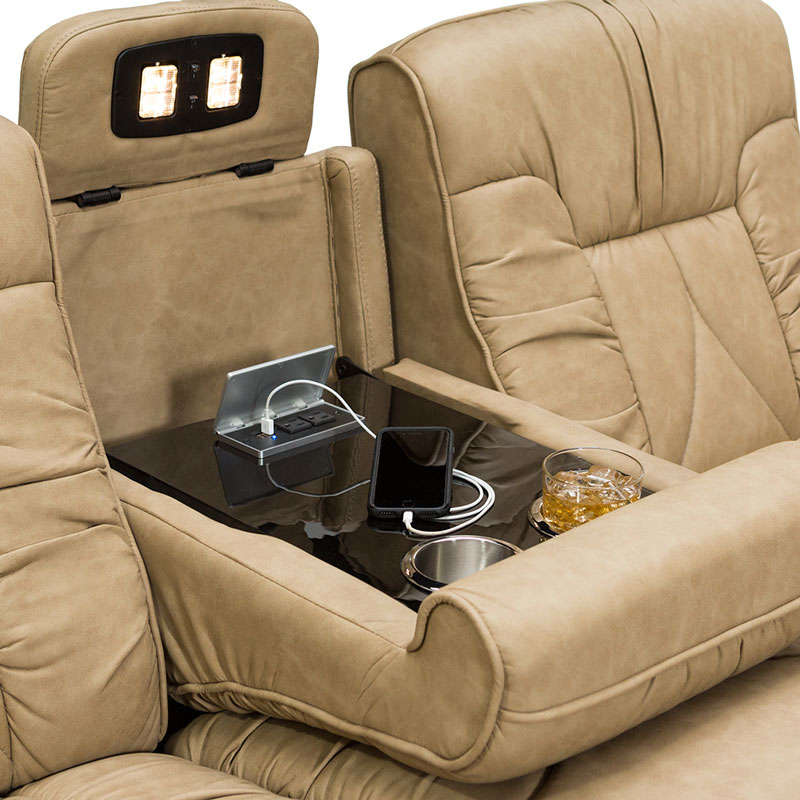 The De Leon RV Recliner Sofa is another top-line model in the DeLeon series, offering plush cushioning and lavish style in a single popular package. The unique two-tone design blends warmth and class for an unforgettable leisure experience. The special “wall hugger” feature allows it to sit as close as 4.5” from the wall, yet still fully recline. Additionally, the RV dual recliner’s center console holds built-in cupholders and storage space essential for those moments when you just need to indulge. The console also folds back into a third seat, transforming the set into an equally luxurious sofa ensemble. The DeLeon series proves itself time and again as a world-class standard in RV furniture.