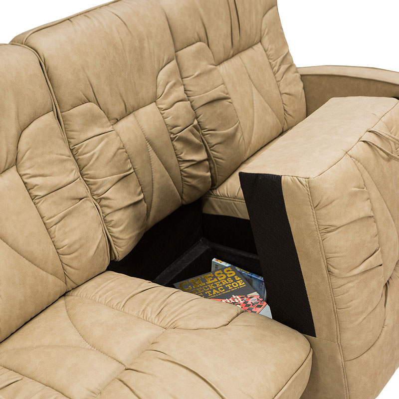 The De Leon RV Recliner Sofa is another top-line model in the DeLeon series, offering plush cushioning and lavish style in a single popular package. The unique two-tone design blends warmth and class for an unforgettable leisure experience. The special “wall hugger” feature allows it to sit as close as 4.5” from the wall, yet still fully recline. Additionally, the RV dual recliner’s center console holds built-in cupholders and storage space essential for those moments when you just need to indulge. The console also folds back into a third seat, transforming the set into an equally luxurious sofa ensemble. The DeLeon series proves itself time and again as a world-class standard in RV furniture.