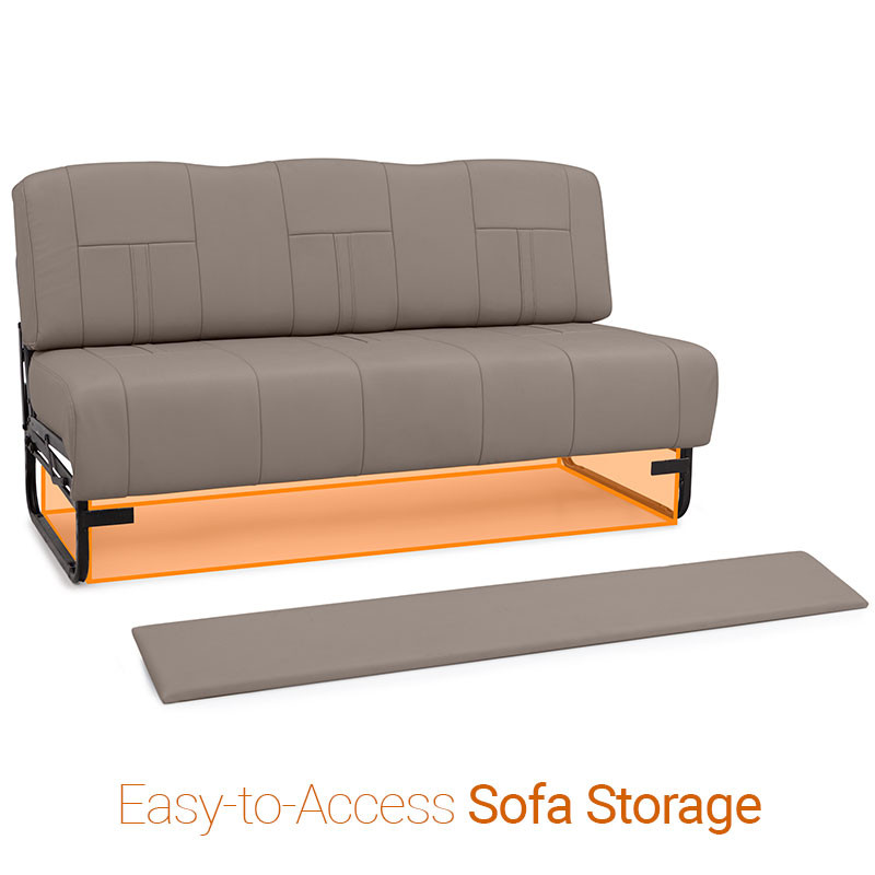 26" L x 62" W x 10" H storage underneath the sofa bed for your valuable items.