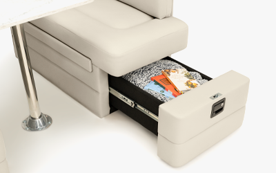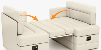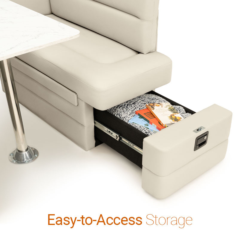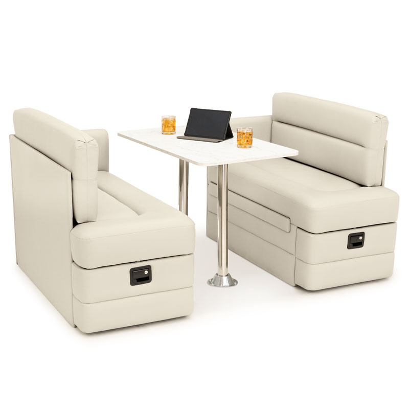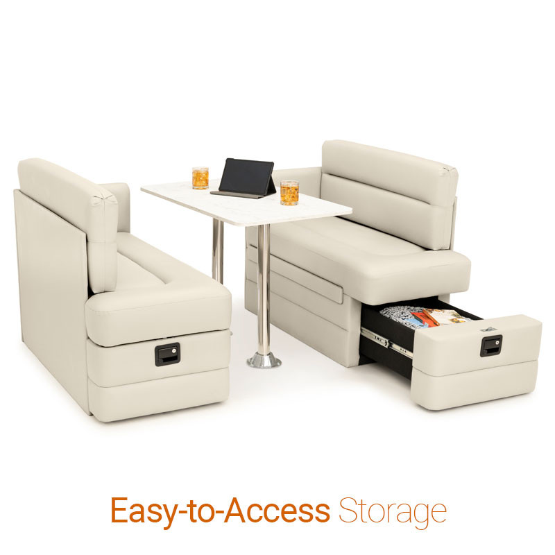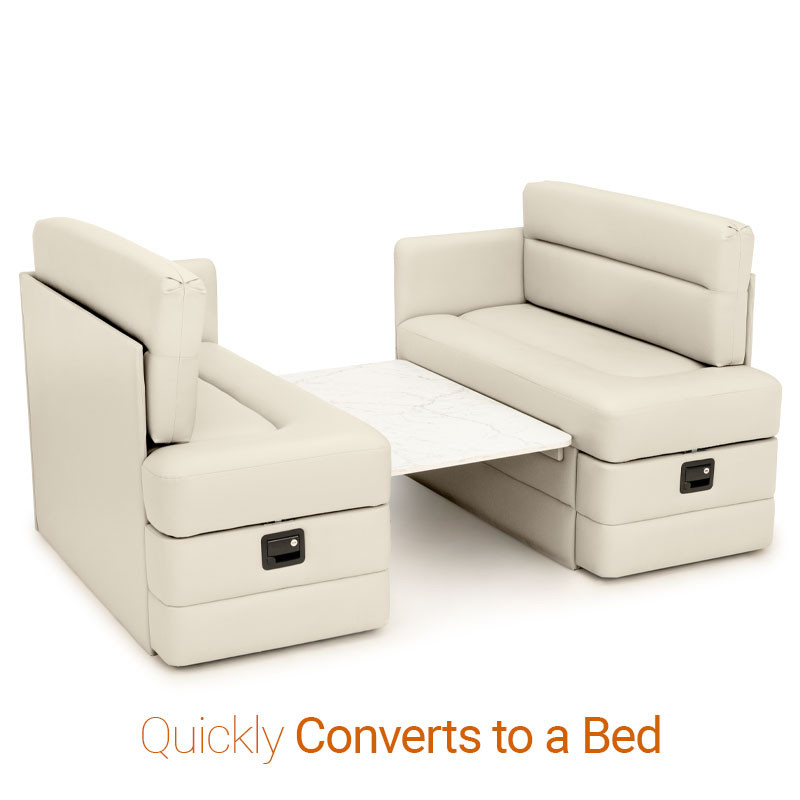 Enhance your RV with the Qualitex Camden Dinette, featuring high-density plush cushioning for maximum comfort during meals or working. Both bench seats are designed with convenient integrated storage, providing easy access to your gear and essentials. When night falls, this versatile unit seamlessly converts into a supportive bed to accommodate extra guests. Finished in a premium pet-friendly Ultimate Material, the Camden is specifically engineered to resist wear and is easy to clean, making it an ideal choice for the active RV lifestyle.