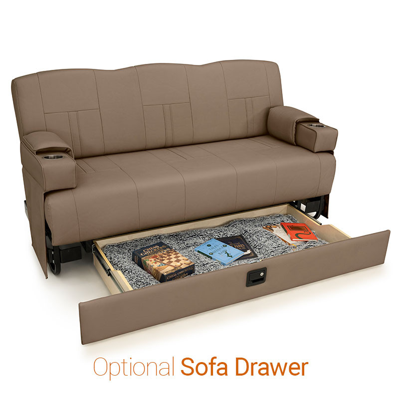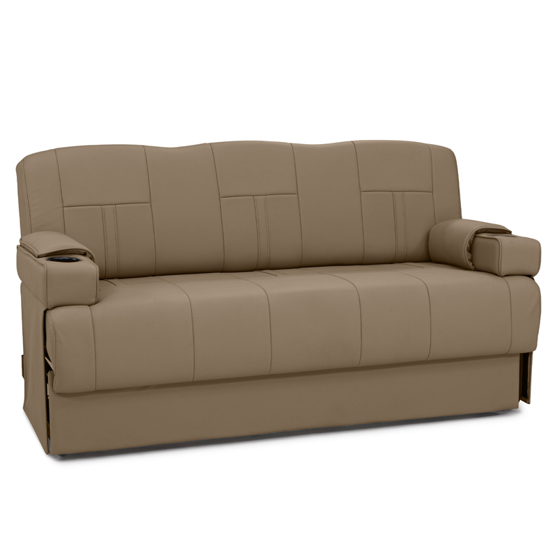 Optimize your RV’s interior with the Ethos SL Sofa Bed, featuring a wall-hugger design that saves space while offering maximum comfort. This versatile sofa bed includes a removable padded slide armrest with a built-in cupholder, adding both convenience and style. The plush seating contours to your body, while the fold-out bed provides ample space for two. Upholstered in heavy-duty, commercial-grade Ultimate Leather, it delivers exceptional resistance to weather and fading. Built for lasting durability with a no-peel or crack assurance, the Ethos SL Sofa Bed stays vibrant and reliable even under tough conditions—making it a smart and stylish choice for RV living.